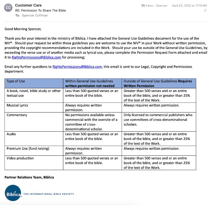 I began recording chapters of the Bible on the Bible App and posting them on Social Media Ministries. I thought that even if I wasn’t able to record sermons, I could at least get some content out there. YouVersion was okay with this. Biblica also was okay with this as long as it was less than 500 verses or less than an entire book. Since I was doing one video per chapter, my request fit within their usage guidelines.